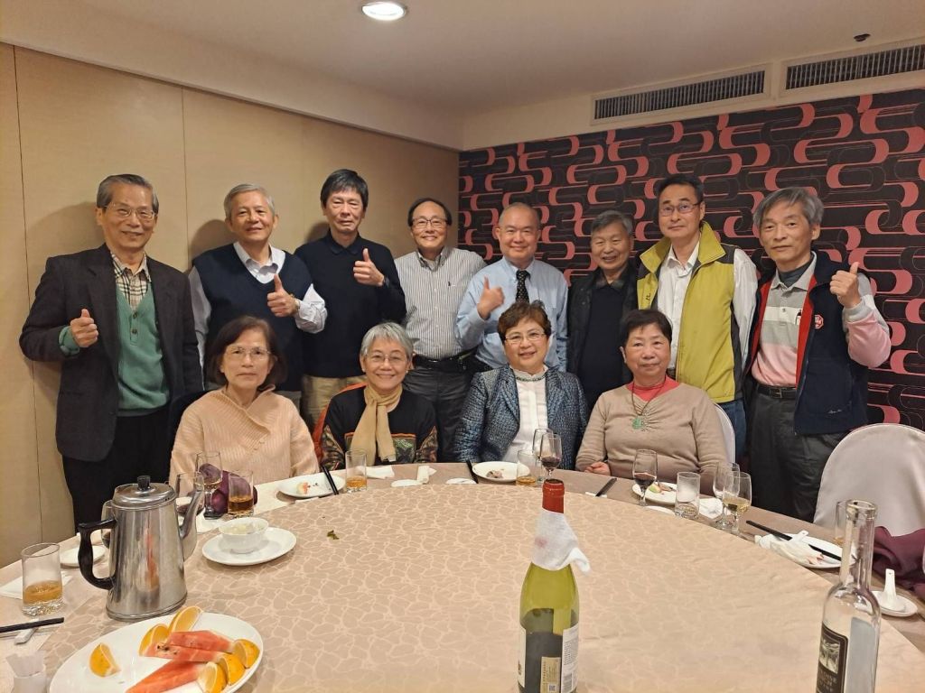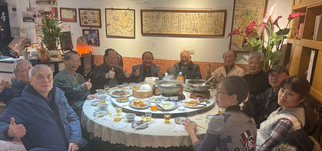 25日中午應草屯同鄉學長洋慈兄邀約,與其出版社同仁及兄弟好友們,一起至北投奇岩知名客家菜餐館〔我家客家菜〕歲末餐敘。品嚐傳統客家菜與其傳承特色〔茶蝦飯〕的美味,合照如照片2。26日在高雄的弟弟文柏搭高鐵北上参加其中市一中的同學會。約我下午2:00前往敦化南路二段〔悅上海〕餐廳會面。我準時前往聚會,並向市一中學弟們致意,合照如照片3。從家裡走至餐廳約12分鐘。餐敘後,與文柏再散步回到文昌街家裡坐坐,因趕高鐵時間,也沒待多久。真是巧遇,該屆同學會召集人饒班長的哥哥饒樹人也是我在中市一中的同屆同學。當天晚上前往羅斯福路3段37號8樓〔博凱音樂〕聆賞小女洪敬婷舉辦的〔台日聯音,璀璨金笛〕音樂會,會後與朋友們一起合照(如照片4)。