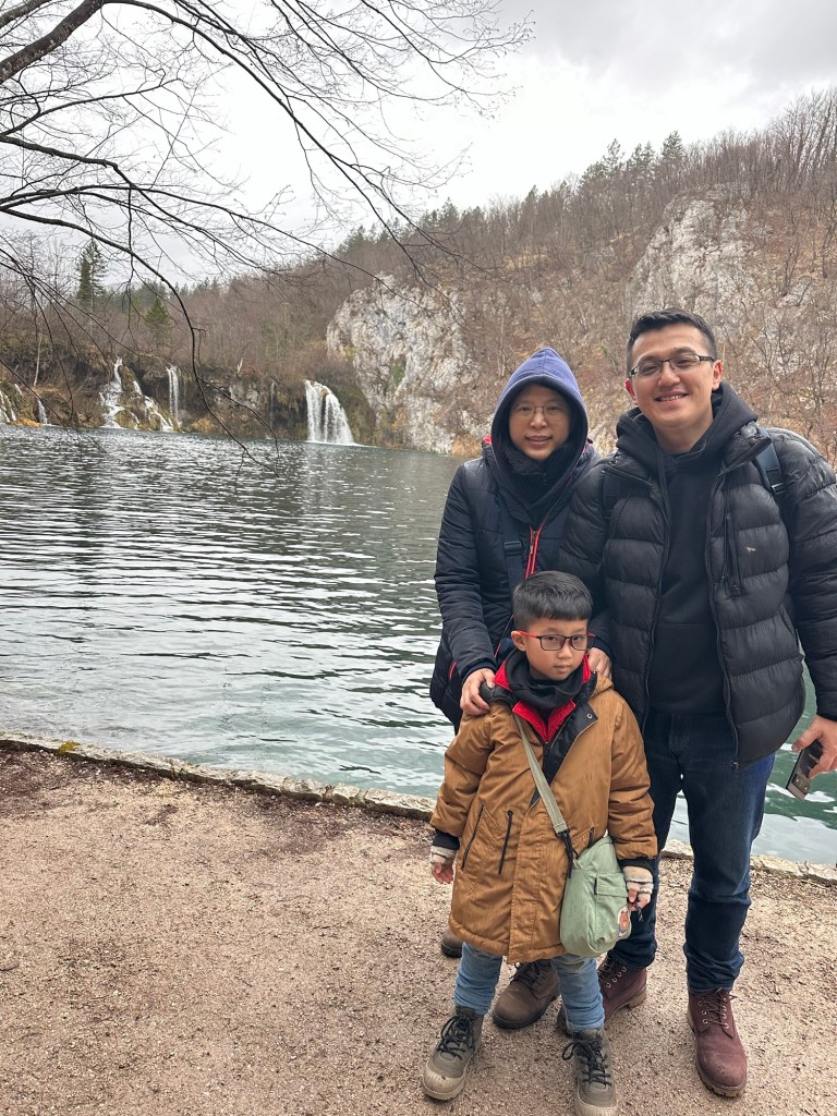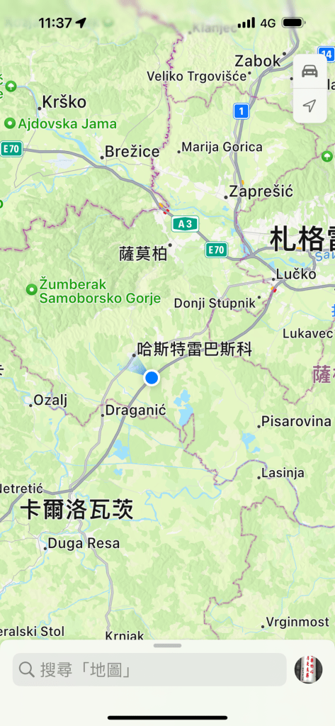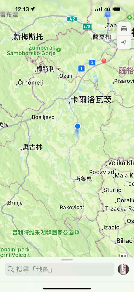 2 月10 日(農曆正月初一)晨8:30 自斯洛維尼亞首都盧比安納(Ljubljana, 盧布爾雅那)出發,往南之克羅埃西亞的16 湖行走,導遊說250 公里,但是開到13:00 才到。忍了30 分鐘,到達前10 分鐘,我吐了。如果沒有在高速公路開過頭又折返的30 分鐘,或許我可以免吐了吧⋯⋯我跟導遊說走錯而折返,他還反駁說沒錯,之後才公開𠄘認走錯。殊不知我有沿途研究衞星地圖的興趣,這附近只有一條高速公路,欲往16 湖必須在卡爾洛瓦茨右転山路往南,司機錯過頭了很久才下高速折返。我在從斯洛維尼亞首都出發時起在每個關鍵點有都截圖,包括在新梅斯托附近離開高速公路転走山路,並在山路被警察攔下盤查護照的地點、斯洛維尼亞和克羅埃西亞的國界點、離開山路在Kucevice 東南方再上高速公路(往東)的地點都有截圖作為研究資料。我習慣於想了解我身在地圖上的何處,google 地圖及截圖提供了方便。