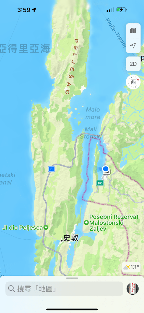 Polace 是波西米亞寶貴的濱海城鎮,該國是大陸型國家,只有這附近30 公里左右的出海地方,而且地型奇怪,所謂「海」也只是一個海灣,外面被狹長的半島包著,半𡷊之外還有更大的海灣及更大的半𡷊包圍著,那更大的半島則屬於克羅埃西亞,其中北端與克羅埃西亞的大陸有跨海大橋及公路相通,橋以外圈仍然包圍著波西米亞的海岸,看起來Polace 及波西米亞人要出海仍必須穿過克羅埃西亞的海橋,不知這是什麼複雜的國際法關係?引用「無害通過原則」?或許他們獨立、分割時已訂好協議、條約解決了?