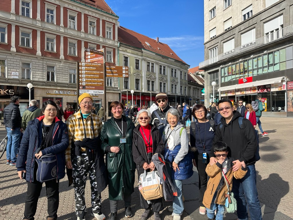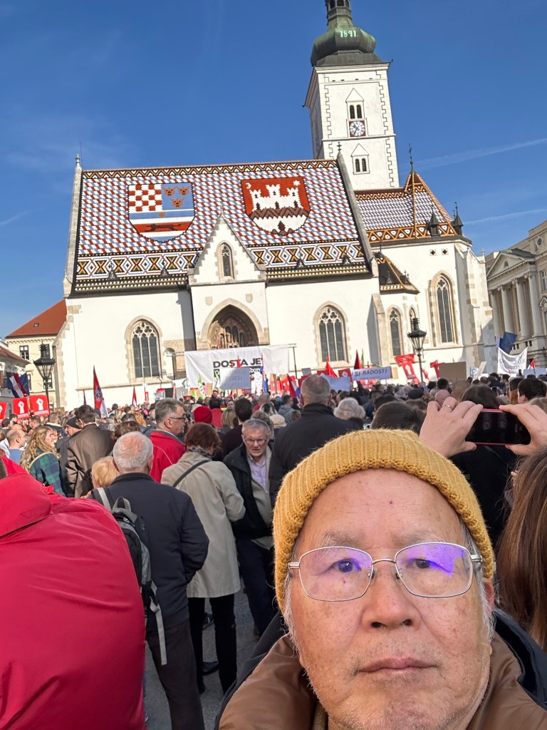 2 月17 日上午8:30 從Zagreb 東北方向的Marija Bistrica出發,向首都Zagreb 前進去觀光,大約50 分鐘到達火車站前下車,走向火車站前寬廣的廣場,走向30 分鐘外的舊街觀光。Croatia 於1991 年獨立,之後加入歐盟。參觀的這一天正好有人民集會遊行,在總理府抗議,但過程和平理性,對觀光客也友善。