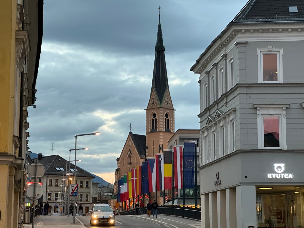 經過上述2 度「出國」、「入境」之前後,於17:00 抵達奧地利南部小城Villach ,已近黃黃昏,利用短暫的「白天」,匆匆忙忙參觀了老街一小時。我走過老區的河橋,算是走的遠的,也拍了許多照片。18:00 吃晚餐,沒想到第一家餐廳超出導遊公司的預算(13 歐元),又換了第二家比較平價的中餐。