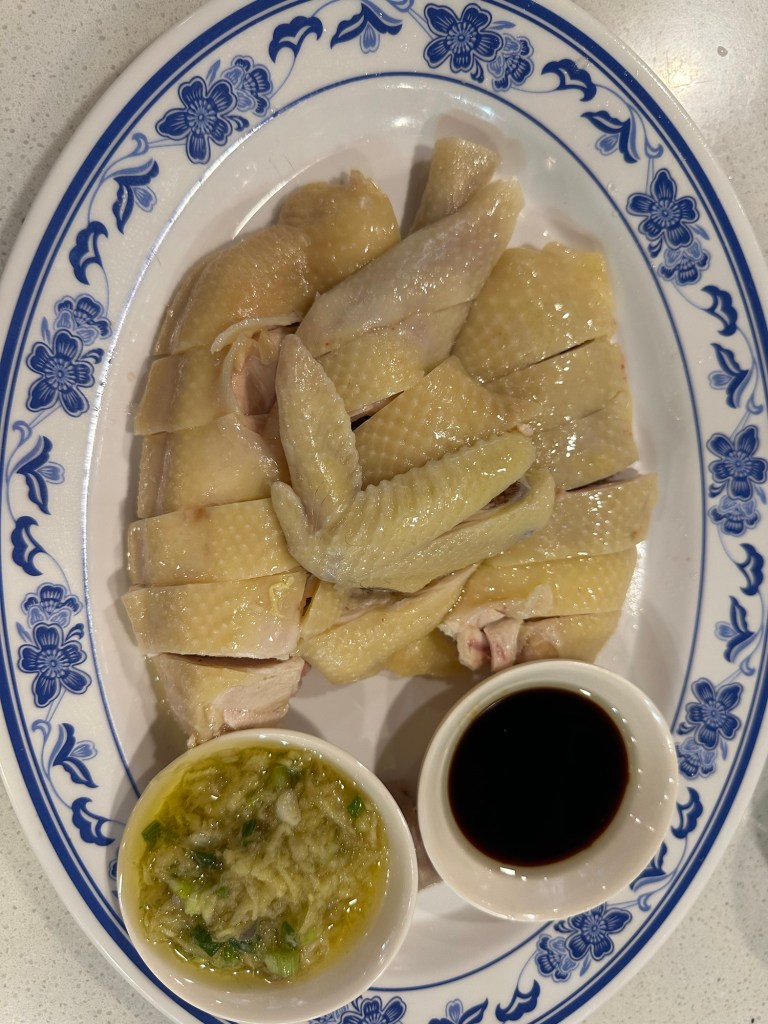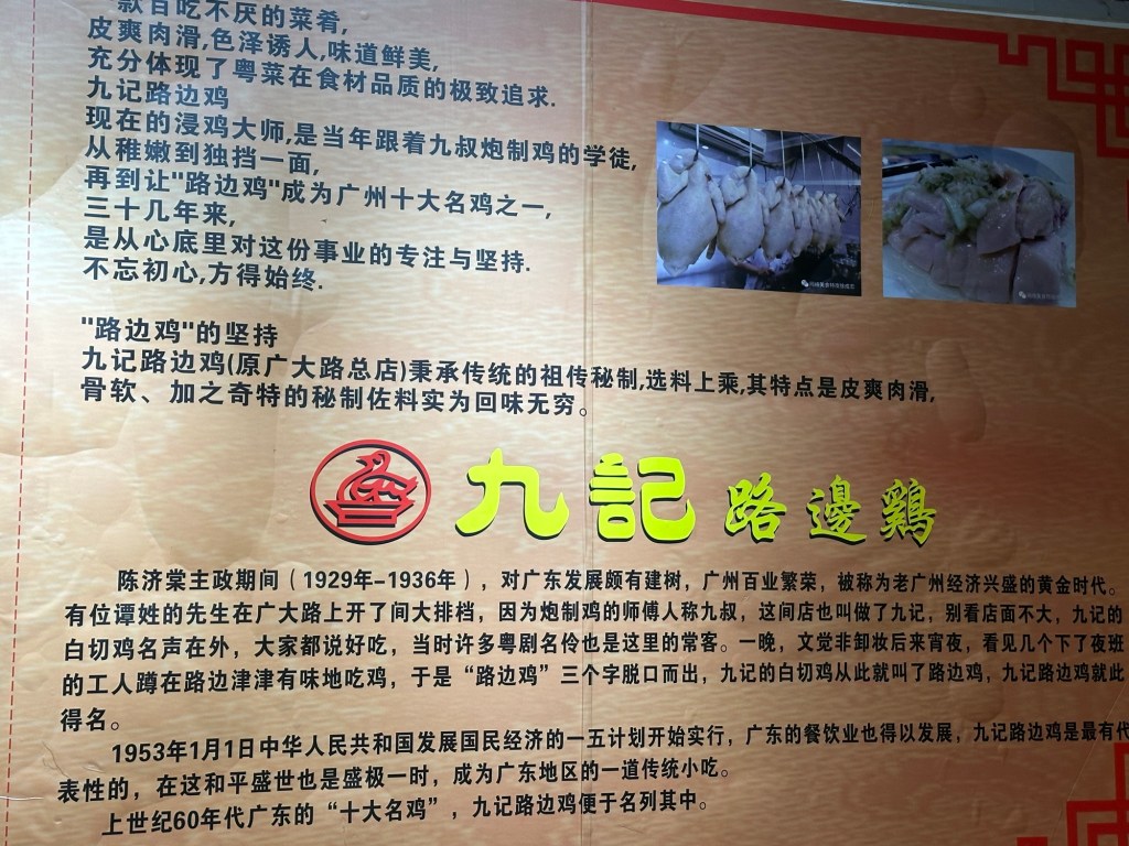 試了幾家餐廳,邱董覺得還是旅館附近的「路邊雞」(濱江店,濱江西路270 號,近海珠大橋)比較好吃,今天3/19午餐又來了,點招牌菜「九記雞皇」、魚皮、青菜,再加上昨天送的半條「浦坑鯇魚」。此店真有誠意,今天發現這贈送的魚還真大,吃起來很過癮。邱董(政大法律畢)說明天離開廣州前往深圳前,明天中午再來吃。牆壁上寫著: 「路邊雞」由文覺非創立於陳濟棠於廣東主政的年代。