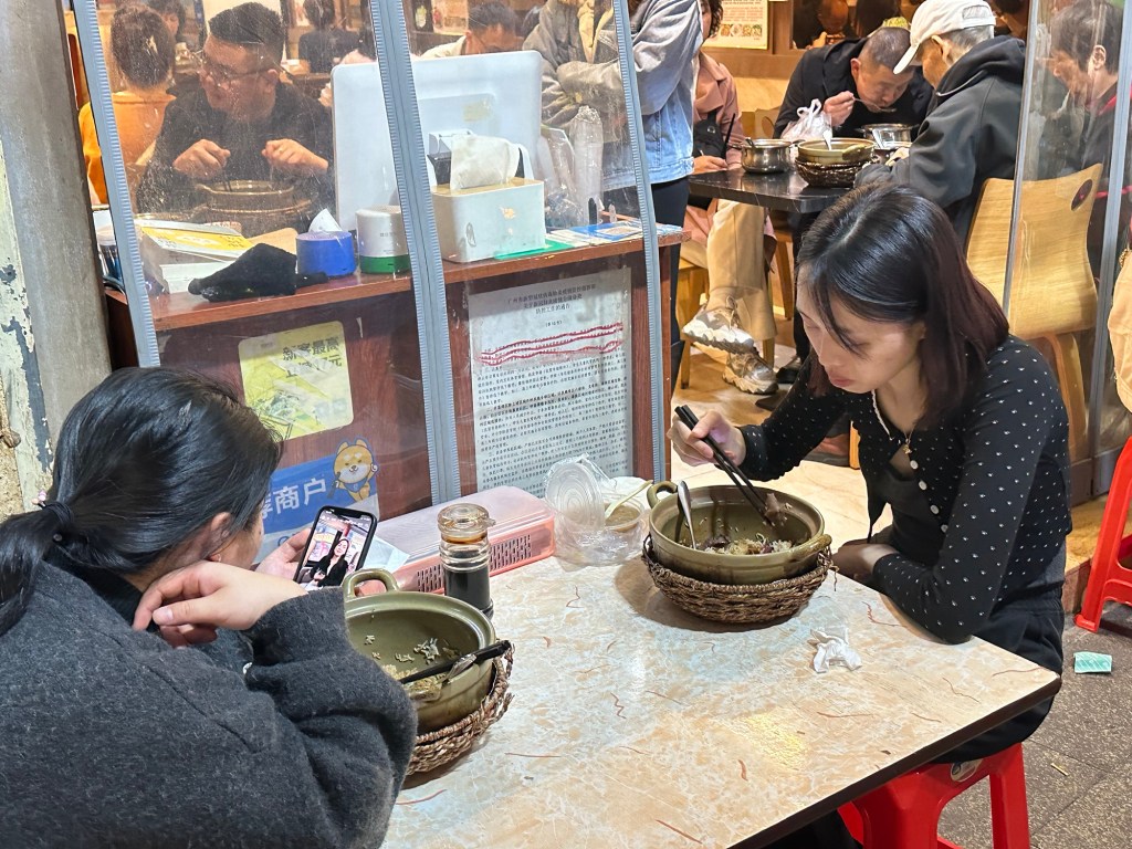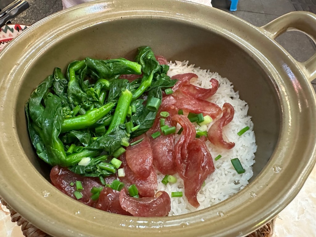 在街頭吃了廣州的臘腸堡飯,真香、好吃,當地人不分男女均一大鍋我和邱董只能二人分食一大鍋,外點一小碗枸𣏌補腎豬肝青菜湯,勉強湊成二碗。
