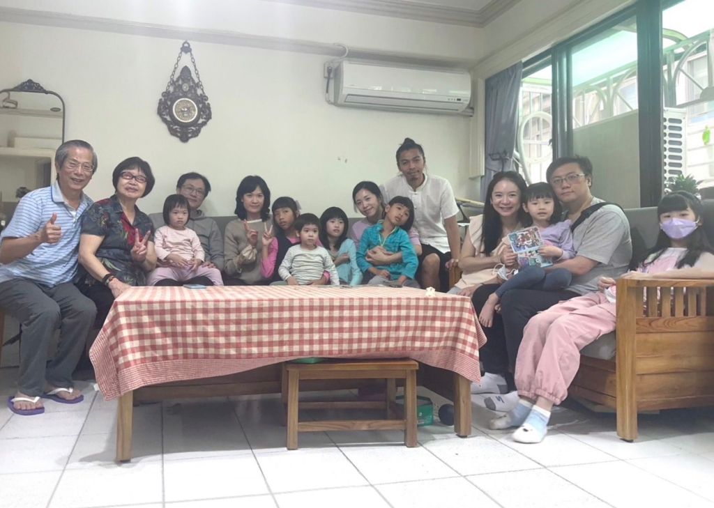 4月5日清明節,兒子、媳婦與大女兒、大女婿及小女兒、小女婿,大家相約回文昌街老家聚會餐敘。爺爺、奶奶與孫子、孫女們三代同堂,中午吃春卷(台語潤餅)每個人先用潤餅皮為底舖上花生粉、再將奶奶準備好的各種各樣的菜色依序舖上:海苔、芹菜、豆干、高麗菜、紅蘿蔔、四季豆、紅燒肉、豆芽菜、滷蛋、炸豆皮等等餡料),每人吃兩套春卷,再配吃香腸、滷蛋、雞肉,喝蒜頭雞湯。餐後吃些水果,有香蕉、鳳梨、蘋果、枇杷、芭樂、橘子等。然後大家一起在文昌街居家合照,如照片1。