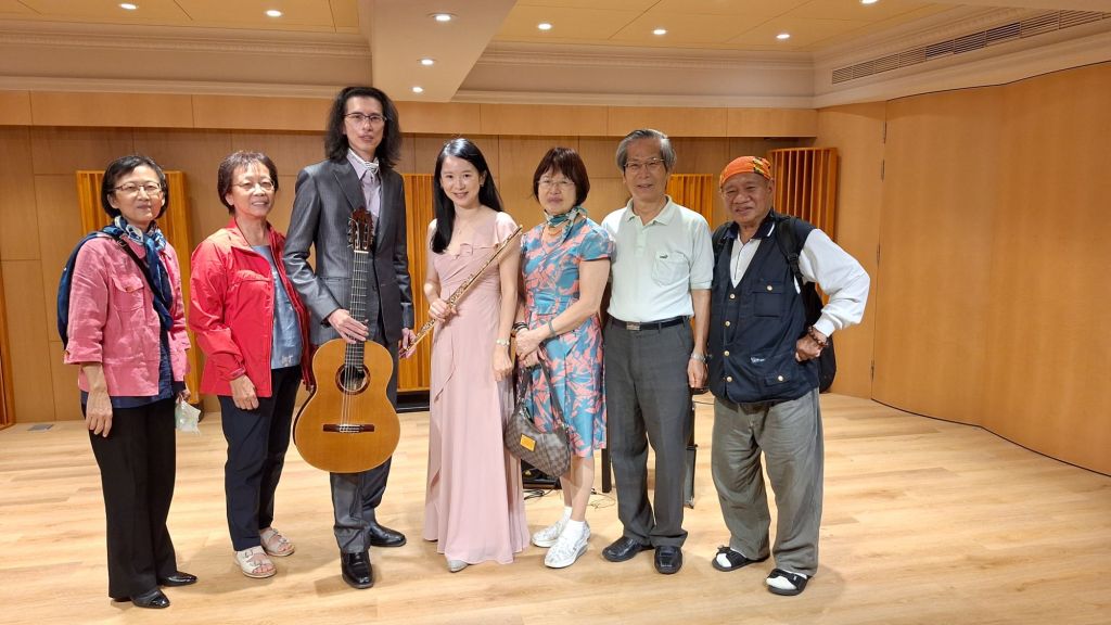16日晚上在南京東路二段124號9樓〔卓悅藝文中心〕聆賞〔長笛與吉他二重奏〕音樂演奏會,會後合照如照片6。21日参加台北市臺中一中校友會春季旅遊活動,搭遊覽車前往苗栗縣卓蘭鎮〔花露休閒農場】觀賞繡球花、蘭花等各區花園,合照如照片7,並在園內餐廳午餐。下午参觀〔雪霸國家公園汶水遊客中心】,晚上在龍潭〔桃群餐廳〕晚餐。