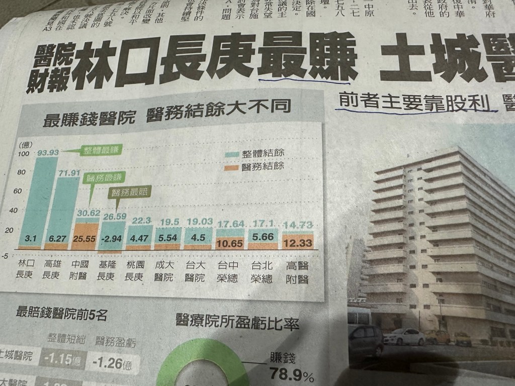 衞福部健保署於2024 年5 月1 日公布111 年度醫療院所財務報告,林口長庚醫院連七年蟬聯整體結餘最高的醫院,金額達93.93 億元,但主要盈餘來自股利收入,醫療結餘只有3.1 億元。如果單視醫療本業,中國附醫表現最為突出,醫務盈餘25.55 億元。高醫12.33億元,台中榮總10.65 億元、新竹馬偕9.03 億元、、、
