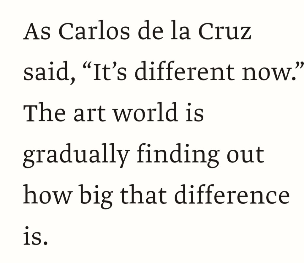 正如卡洛斯·德拉克魯斯所說,「現在不同了。」藝術界正逐漸發現這種差異有多大。