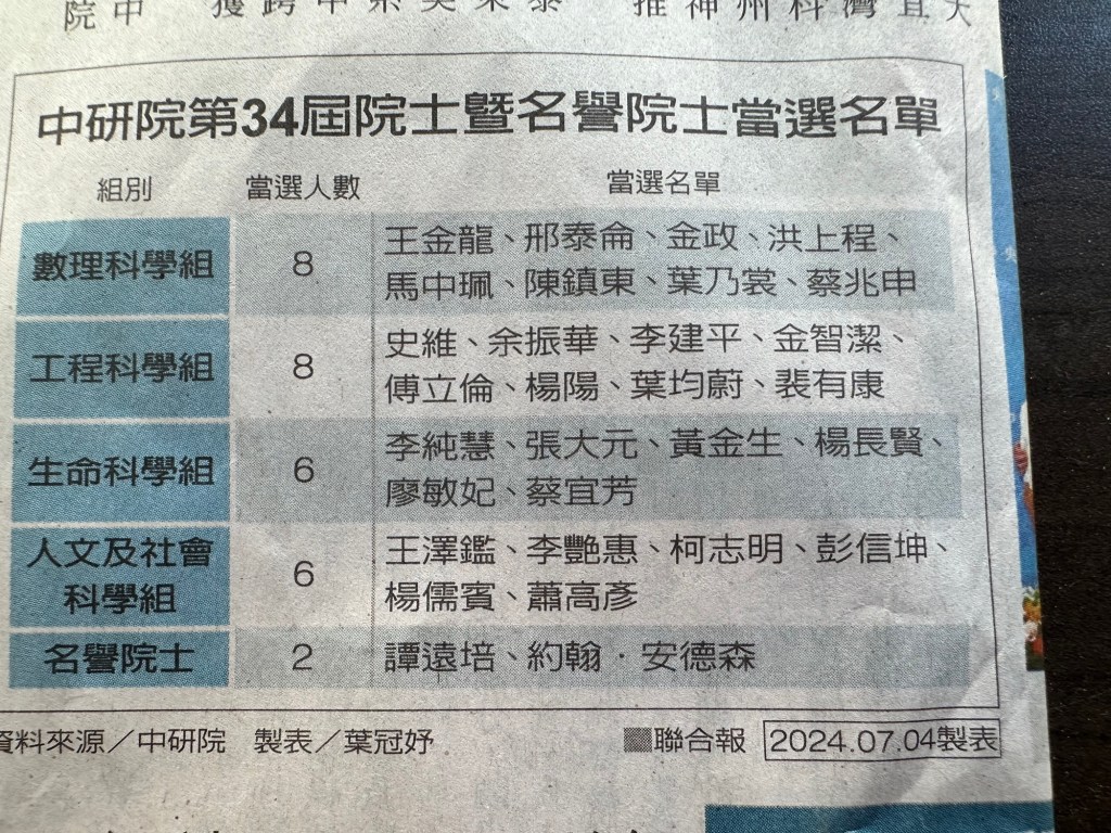 另須指出: 此屆新科院士中「人文及社會科學組」當選六人,報紙稱「也一掃前兩屆的低迷」(113 年7 月5 日聯合報A5 版),除了上述三位外,另有李艷惠、彭信坤、蕭高彥。我再找機會慢慢了解他們。