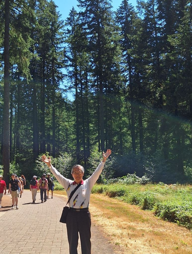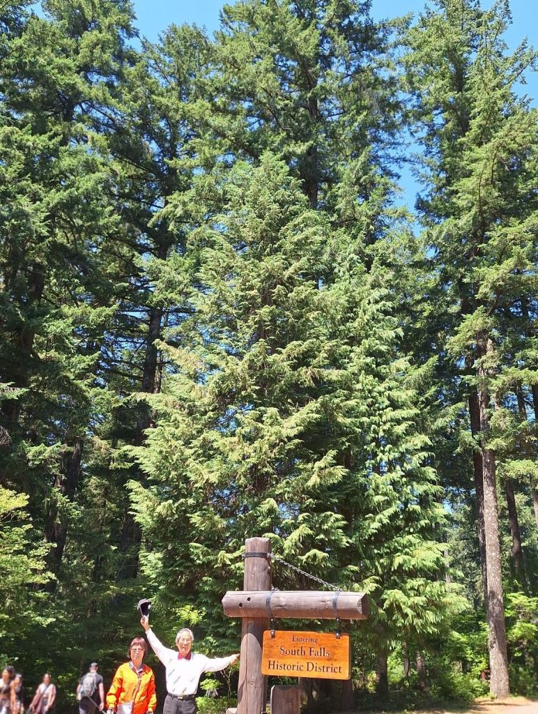 欣賞完南瀑布(South Falls)美景,我們繼續沿著峽谷步道(Canyon Trail)前行走約2公里路,見到另一個低層南瀑布(Lower South Falls),並與瀑布美景合照,如照片5。繞過低層瀑布沿著楓脊步道(Maple Ridge Trail)散步,公園內茂密的松樹高聳林立,森林內清新的空氣,令人神清氣爽,吸收樹林釋放的芬多精,更令人心曠神怡。健走約2公里後,再回到南瀑布停車場,在出入口前樹林拍照如照片6。稍事休息後,繼續開車前往伍德本大型暢貨中心(Woodburn Premium Outlets)逛逛各類商品店,在Polo Ralph Lanren 買了一件短袖T襯衫。接著至波特蘭市區的〔三郎酯〕日本料理店晚餐敘敘舊,餐後開車返回卡馬斯市,結束銀瀑布州立公園之旅。
