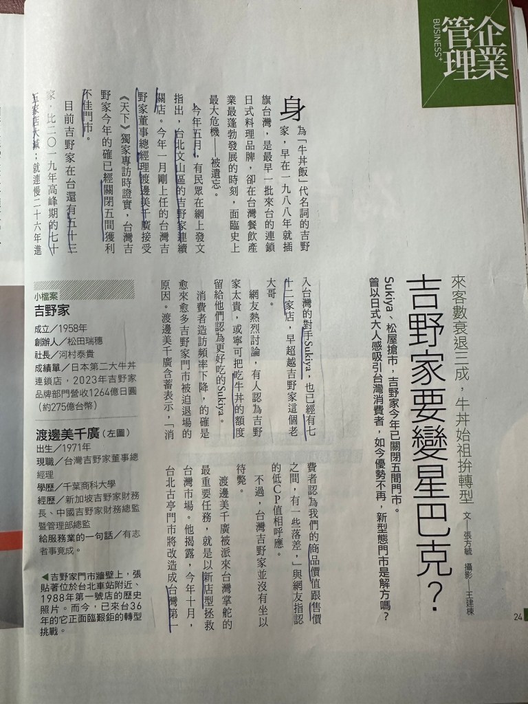 近日閱讀8 月7-20日的「天下雜誌」804 期,看到一篇文章報導「吉野家要變星巴克?」,要點如下:1、2024年一月剛上任的台灣吉野家董事總經理渡邊美千廣接受天下採訪証實吉野家今年已關閉五間獲利不佳的店;目前在台灣還有53 家,比2019 年高峰期的75 家大減; 就連慢進入台灣26 年的對手Sukiya 也已經有72 家店;2、渡邊被派到台灣的任務就是以「新店型」拯救台灣市場,台北古亭門市將改造成新型態的「亨飪與舒適」示範門市,這是在日本自2016 年開始的新店型,改變了店的顏色,營造悠閒氣氛,門市附設插座吧台,花162 日圓(35 NT)就能茶、咖啡,可樂喝到飽,歡迎顧客久坐,並提供多元餐點品項,由17 種增加至25-30 項,以提高CP 值,新型店在日本已經有390 間。3、在日本改造後的分店營收增加一成,增加了女性客群至三至五成、、、(2024、8、7-20 天下雜誌P.24-27)