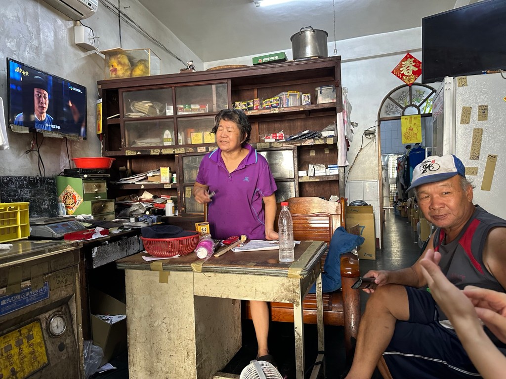 阿滿在小鎮開的這家雜貨店已經60 年了,人和人氣旺,薄利多銷,竟然沒有被超商打敗,不但活著,還愈來的旺,⋯⋯她很得意她的先生的爸爸(㗳官)在35年前稱贊她生意做的比他老人家好,因為這個贊美,她(他)們經營雜貨店到現在,她的兒子在高科技業,她和先生林桑、兒子也很會做長期投資的股票,報給我幾支獲利股,林桑還細說第一銅是華隆設立、60 張楊天生的公司的股票誏他有虧到⋯⋯可見他(她)們買股票很多年了。雜貨店的店面透天屋也是自己的,人氣好,成為「另類社區交流中心」,莫非史遷所言「既饒爭時」? 她(他)聘僱了力量很大的小黃先生幫忙店務。