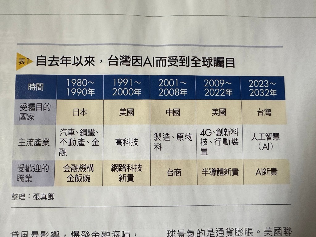 1、全球經濟的掌握權幾乎都由東西方輪流主導,每8年~12年總會形成一個循環和主流產業(和我譯「中國文明興亡史(興衰史)的「東西輪流」近似);2、1980年~1990年以東方世界日本主導的鋼鐵、汽車、家電、金融、地產商為主;當時受歡迎的職業是金融機構金飯碗;3、1990年至2000年是以西方的美國為主,以高科技、個人電腦、網路火紅,至2000年美國網路普及率從百分之9.2,迅速升為百分之43.1,當時受歡迎的職業是「網路科技新貴」,但到了2000年3月「網路泡沫」,那斯達克跌了百分之39;4、2001至2008年以東方的中國(大陸)為主,帶領金磚四國,提供便宜的土地、人力、原物料,生產便宜又品質不差的產品,行銷全世界,台資、外資企業也紛紛進軍大陸,「台商」成為有錢人的代名詞;5、2008年金融海嘯,美國大膽「量化寬鬆」(QE),大量撒錢,美國由谷底翻身,以殺手級的創新科技再度稱霸世界,蘋果(Apple)、4G加上行動裝置引爆大商機,台灣電子產業成為蘋果手機的供應鍊和組裝廠,「一顆蘋果救台灣」,台灣景氣再次出現向上的契機,從2008年至2021年全球股市走了十多年的大多頭;6、東方的台灣:2022年以後Open AI橫空出世,AI成為明星產業,「台灣囝」黃仁勳在美國立大業,輝達股價也帶動台積電、廣達、技嘉、緯創、鴻海……很多股票上漲數倍;台灣是科技島、也是AI島,台灣電子產業聚落完整,台灣準備走10年大運。我們何其有幸,在這一波AI的浪潮下生在台灣,享受高科技帶來的榮景,人一輩子遇不到幾次這樣的機遇……(張真卿,台灣準備走十年大運)