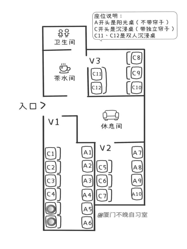 那是一棟同安市中心、臨溪的老公寓,她祖父留下來的老房子(有40 年吧)、約80 平方米,她在室內設立了近24個座位,每位以5-7 元人民幣/ 小時(一天60 元)出租給年輕人(18-26 歲)作為「自習室」(K 書中心),-切門禁、開門、訂位、付款皆用小程式遠距離信息自動管理(無人),只給一位長期使用者(唸醫科的)「免費使用」但兼「管理人」(他會擦擦桌子),另每半個月請鐘點工打掃(廁所是重點),每次100元人民幣費用。