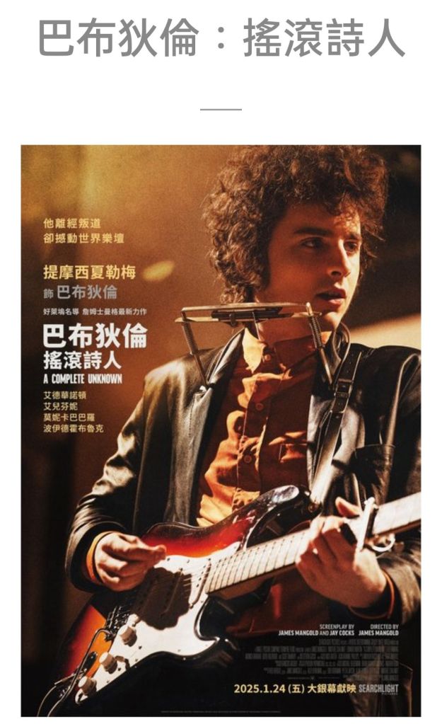 在詹姆士曼格執導的《巴布狄倫:搖滾詩人》中,我們將看到這位傳奇歌手如何一步步從無名少年成為改變時代的聲音。提摩西夏勒梅挑戰出演巴布·狄倫,並親自演唱片中歌曲,展現他如何用音樂與詞句捕捉時代精神,並在成名與叛逆之間做出震撼全球文化的選擇。