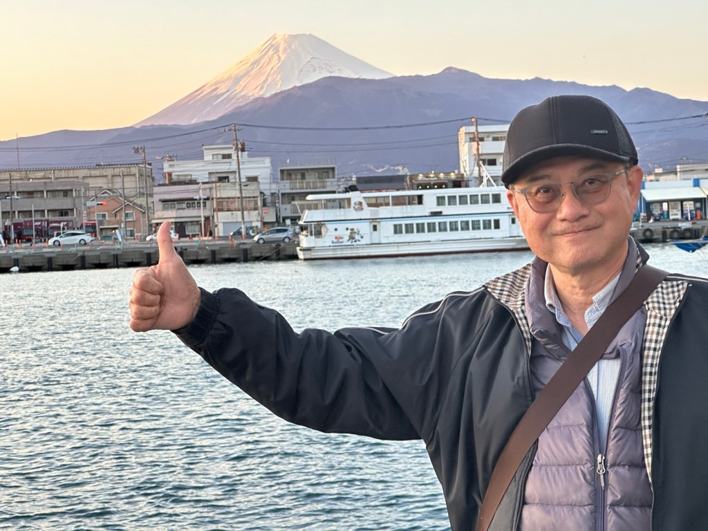 下午三時許,我們從火車站前大道,步行往2.1 公里外的沼津港,看到港西方的夕陽,抬頭又看到遠方的富士山,白頭的富士山,雄偉美麗,這是意外的驚喜。回程也幸運的叫到計程車,趕回火車站旁買打折的食物,一切順心。
