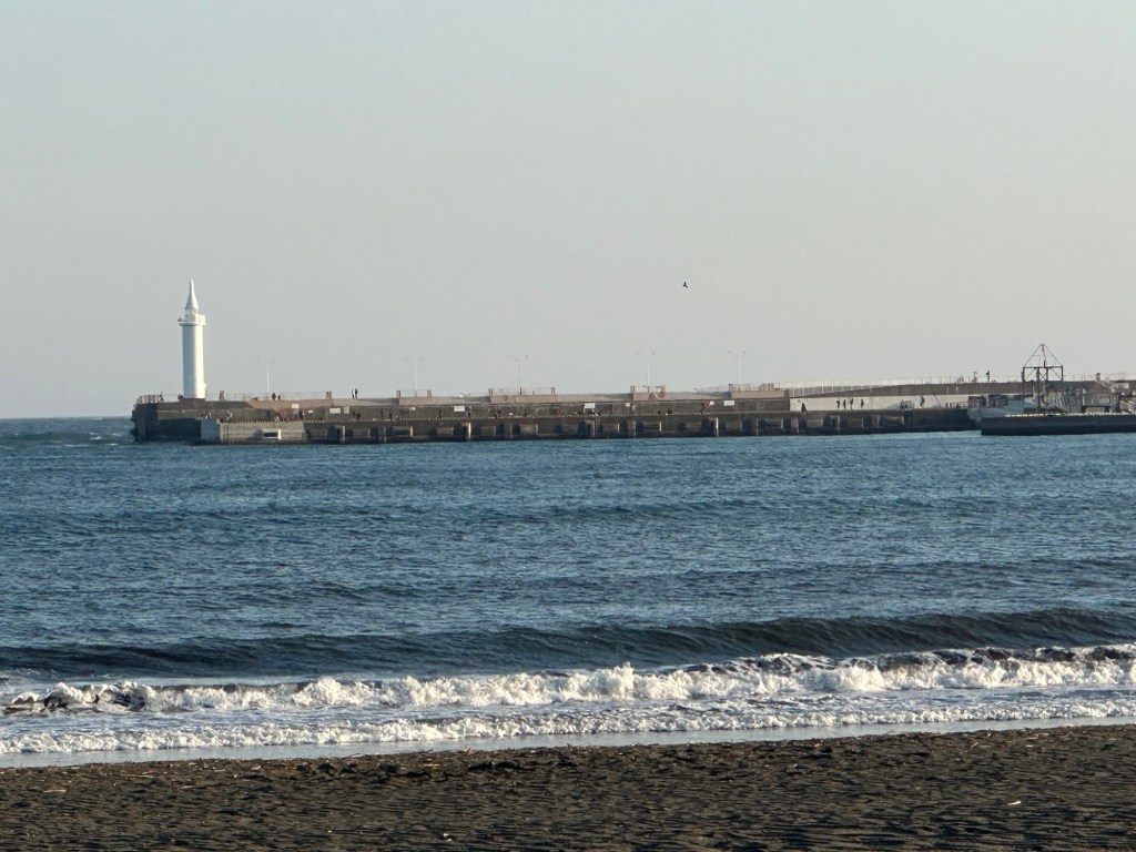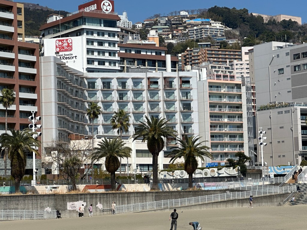 經過這幾天,對東海道地區的交通有一些了解了。3 月21 日上午離開三𡷊市往藤沢市,中途先在熱海市下車,帶邱董一遊熱海,先在車站三樓寄放行李,然後在車站右前方逛站前二條頗有人潮的商店街,之後,沿途走下坡直到海邊,約走30 分鐘,在海邊沙灘欣賞海景、拍照。