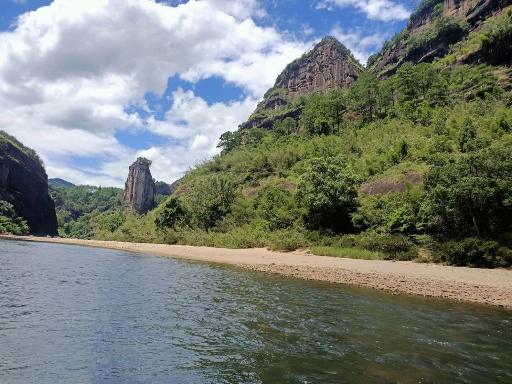8月15日遊九曲溪,自星村鎮乘竹筏順流而下。坐在竹筏上,筏夫說盈盈一水折為九曲,曲曲動人。眼觀兩岸峰岩峻峭,拔地而起,耳聽棹槳劃水,激起淙淙水聲,而藍天白雲與其倒影,則天上水下共徘徊也。