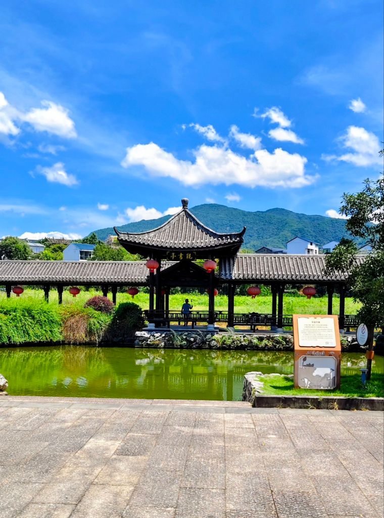 我特地在方塘前俯看水底,正好有幾簇遊蕩的白雲倒影與藍天共徘徊,可以想像當年朱熹在同一地點仰觀俯察,腦中若有所思,立即筆蘸墨水,倏然成詩,一首千年誦吟的哲理詩横空出世,道盡人間讀書窮理妙法。