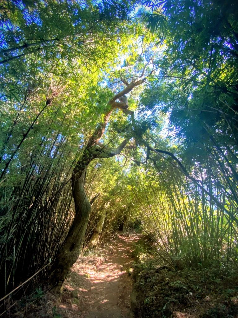 從清天宮開始,一路拾級而上,沿途穿越竹林與相思樹,感受到饒富多趣的山林生態,每跨幾步,隨時都可目睹翩翩蝶影,時而見到小蜥蜴在石階上、旁邊的雜草叢爬行的倩影。
