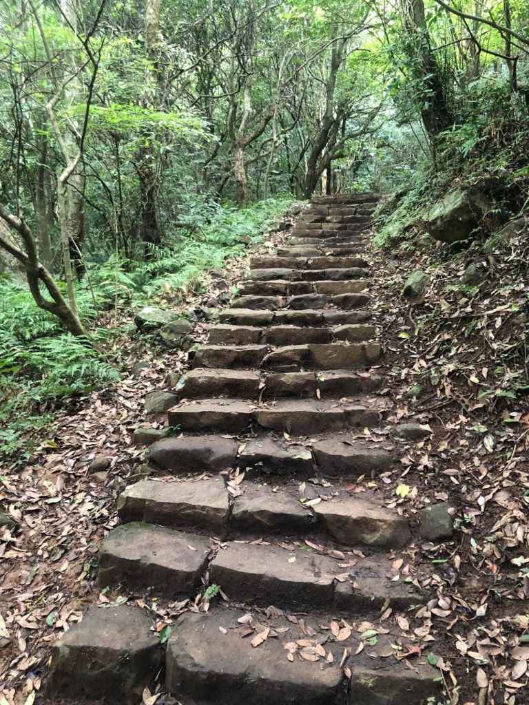 由於沿途都是陡爬狀態,雖然林蔭遮天,稍除日曬之苦,可也讓人累到汗流浹背,氣喘吁吁,步履蹣跚,不時停歇休憩片刻,登山疲憊在身,但心裡愉悅不在話下。