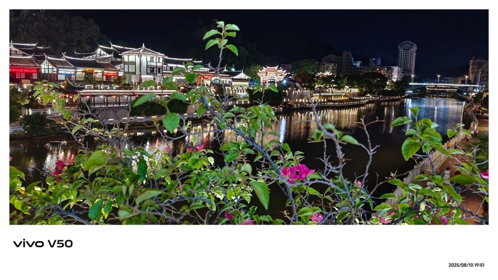 橋下是青印溪,溪水潺潺,臨溪街燈及古屋倒影在水底,波光粼粼,與遠處山巒疊翠相映成趣,形成一幅美麗的畫卷。