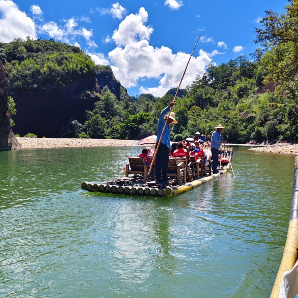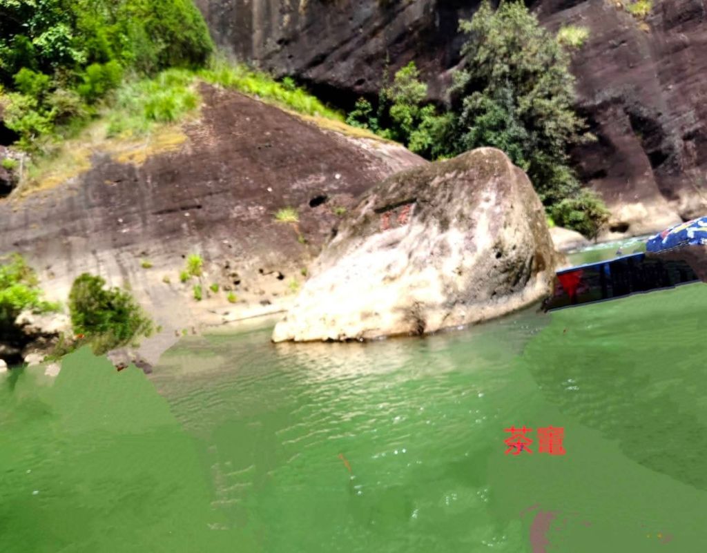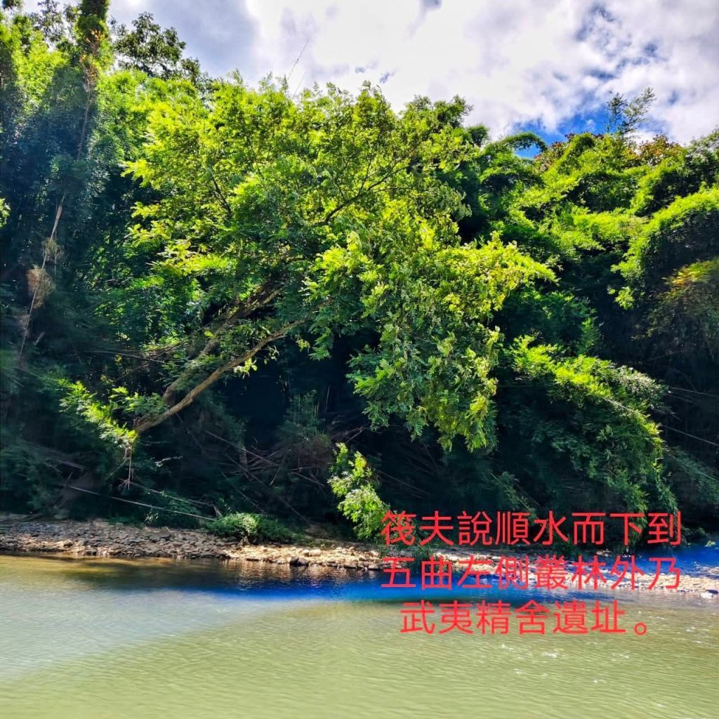 《豔陽下乘坐竹筏遊九曲溪,澗水悠悠。過五曲時,筏夫指出右邊茶竃石所在,並指出左邊的武夷精舍遺跡隱藏於茂密竹林內。乃於舟上靜默憑弔緬懷之。》