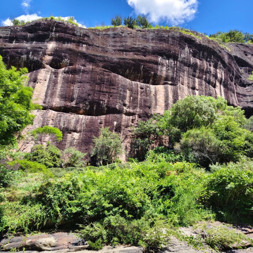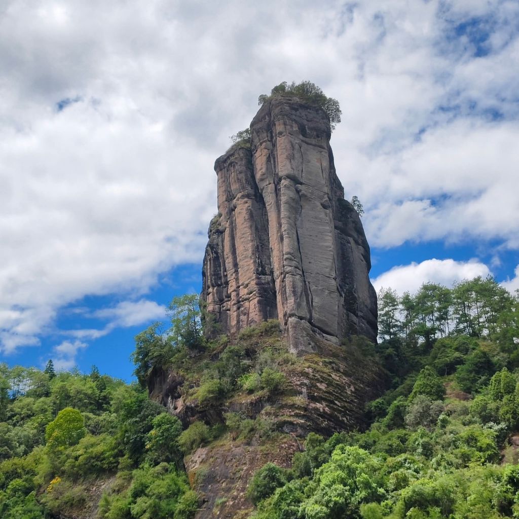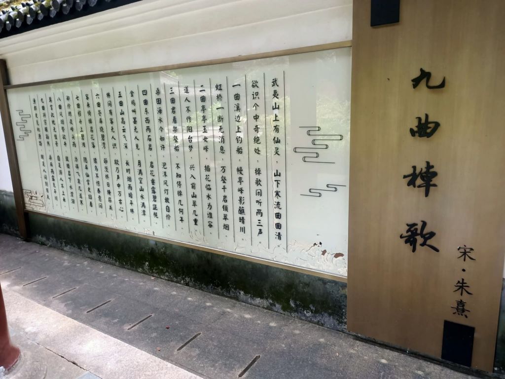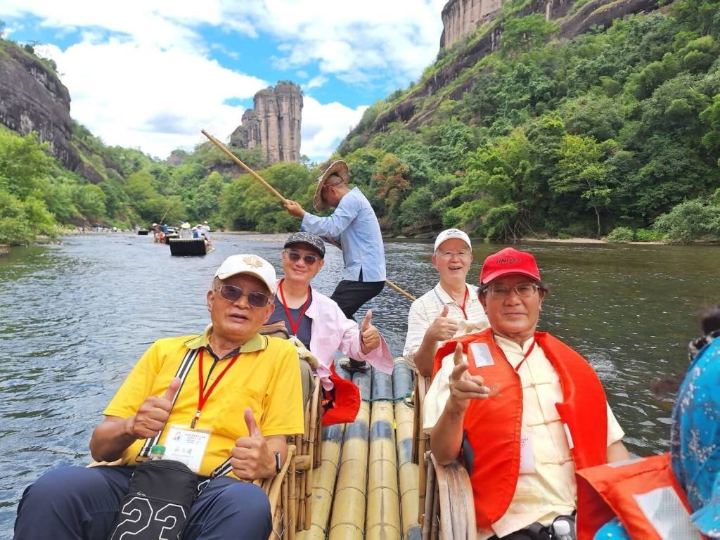 《豔陽下乘坐竹筏遊九曲溪,澗水悠悠。過五曲時,筏夫指出右邊茶竃石所在,並指出左邊的武夷精舍遺跡隱藏於茂密竹林內。乃於舟上靜默憑弔緬懷之。》