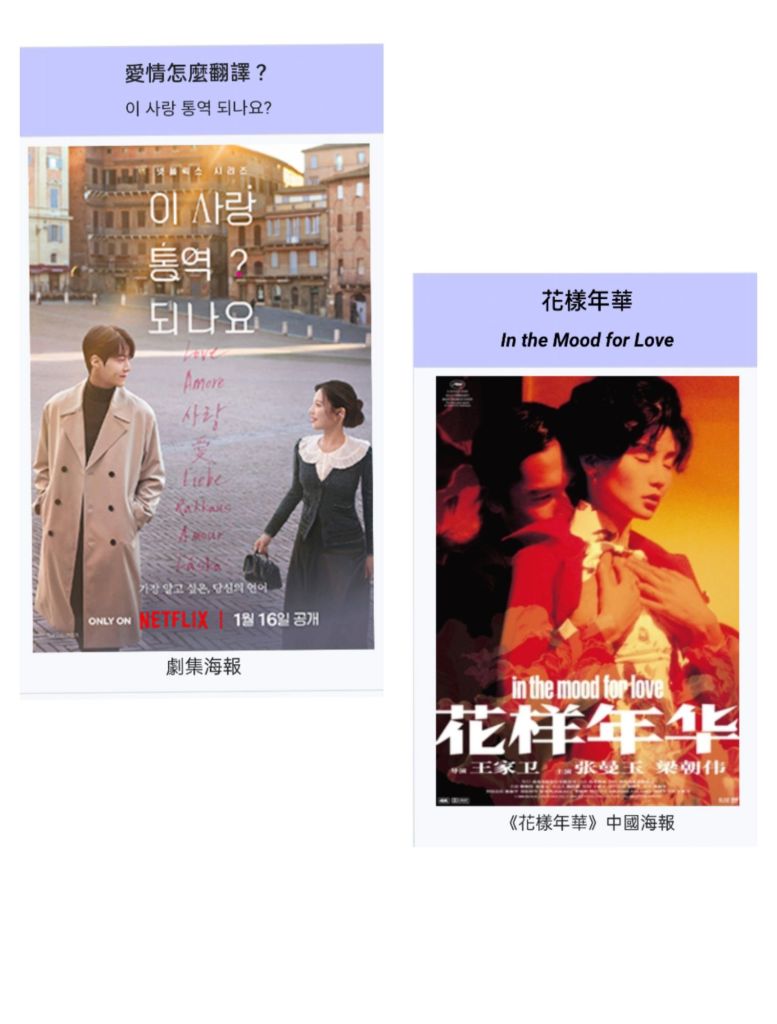 怎麼看,就越看《愛情怎麼翻譯?》和王家衛的《花樣年華》所呈現男女之間(愛、感)情事發展的曲折、纏繞,乃到心有千千難解之結,以及男女主角鏡頭前站位光影投射、打光,蒙太奇剪輯手法,多有雷同之處。